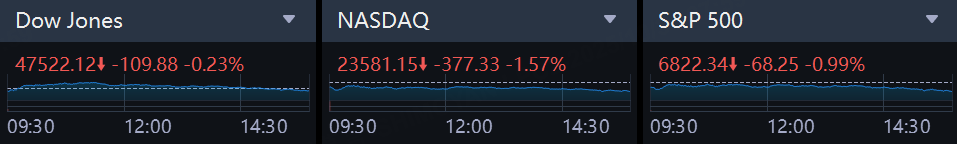 The Dow Jones Industrial Average fell 109.88 points, or 0.23%, to 47,522.12, the S&P 500 lost 68.25 points, or 0.99%, to 6,822.34 and the Nasdaq Composite lost 377.33 points, or 1.57%, to 23,581.15.