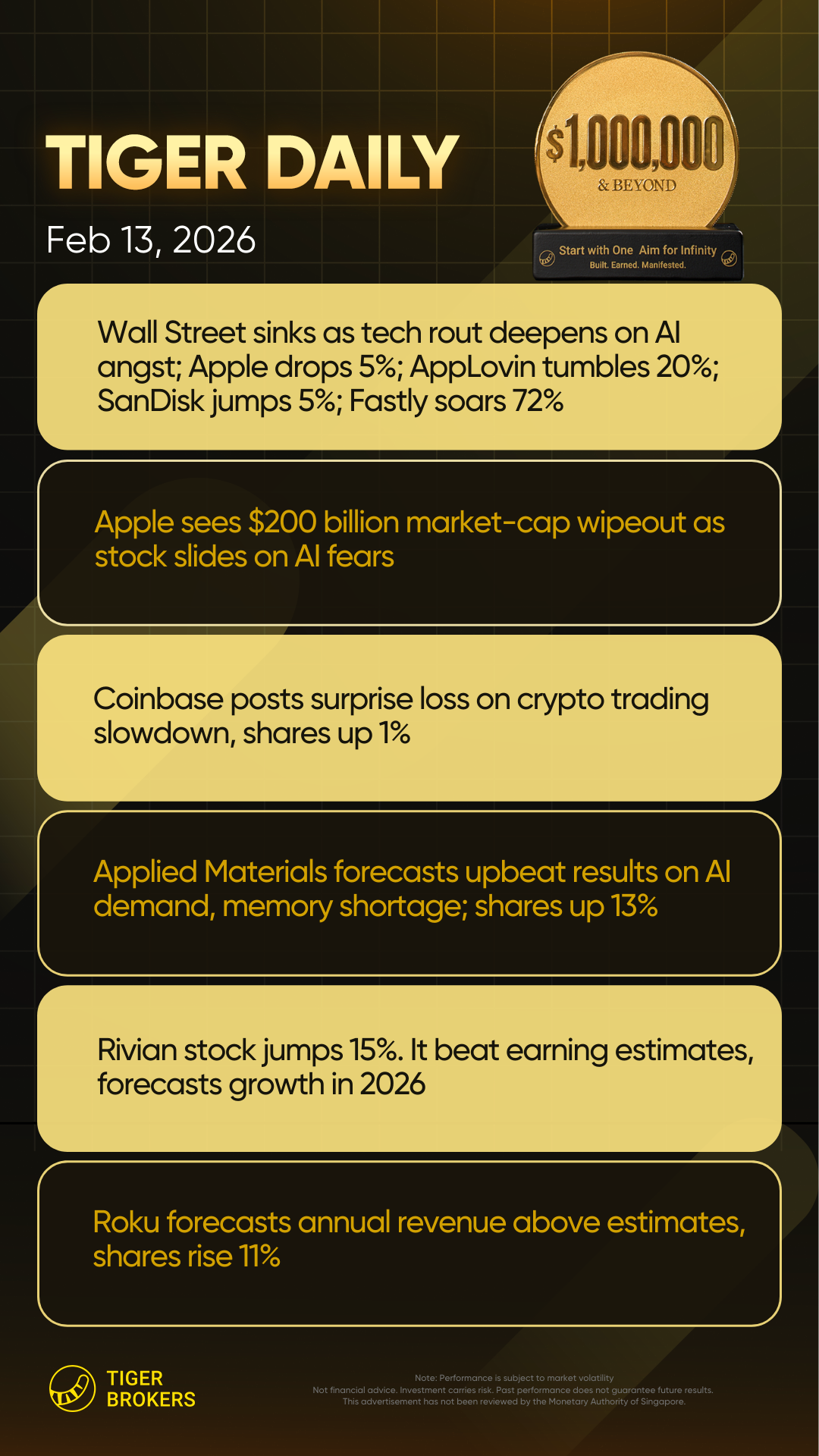 Headline drivers included AI and software prints and guidance: a steep slide in Apple on reported Siri rollout delays, a sharp rally in Fastly on stronger results and outlook, and weakness in AppLovin despite guidance pointing to slower growth. Chip-equipment sentiment was supported by an upbeat outlook from Applied Materials, while Coinbase fell after a surprise quarterly loss, weighing on crypto-linked risk appetite.