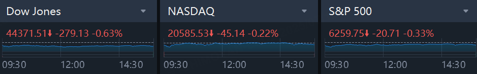 The Dow Jones Industrial Average fell 279.13 points, or 0.63%, to 44,371.51, the S&P 500 lost 20.71 points, or 0.33%, to 6,259.75 and the Nasdaq Composite lost 45.14 points, or 0.22%, to 20,585.53.