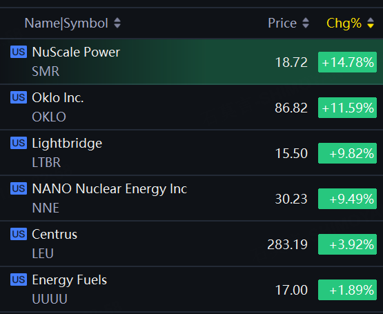 Nuclear stocks gained on Monday. NuScale Power up 15%; Oklo up over 11%; Lightbridge, NANO Nuclear Energy up over 9%.