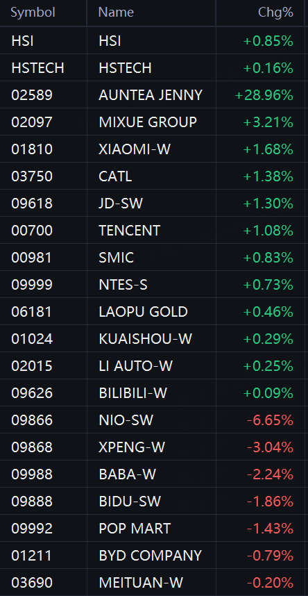 In terms of star stocks, Auntea Jenny rose 29%; Mixue Group rose 3%; Xiaomi rose 2%; CATL, JD.com and Tencent rose 1%; while NIO fell 7%; XPeng fell 3%; Alibaba and Baidu fell 2%; Pop Mart fell 1%.