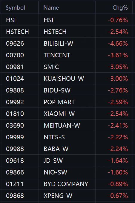 In terms of star stocks, Bilibili fell 5%; Tencent fell 4%; SMIC, Kuaishou, Baidu, Pop Mart, and Xiaomi fell 3%; Meituan, NetEase, Alibaba, JD.com, and NIO fell 2%.