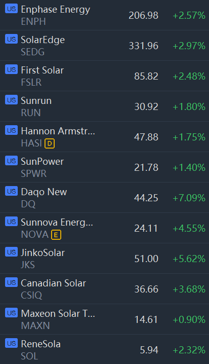 Solar stocks climbed in morning trading. Daqo New, JinkoSolar, Sunnova Energy, SolarEdge, Canadian Solar, SunPower, Sunrun, Maxeon Solar Technologies, ReneSola and Enphase Energy climbed between 1% and 7%.