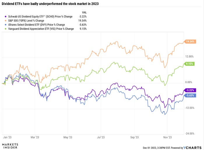 This year, investors' reluctance towards dividend ETFs is also attributed to their underperformance. The previously popular Vanguard Dividend Appreciation ETF (VIG) has only seen a modest 10% increase year-to-date, approaching half of the 19% gain in the S&P 500 Index. Meanwhile, both the Schwab US Dividend Equity ETF (SCHD) and iShares Select Dividend ETF (DVY) are currently in negative territory.