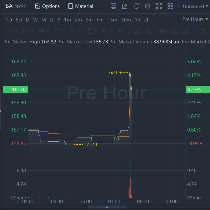 Boeing shares gained 3.27% in premarket trading.The company is fresh from winning high-profile ordersat the Farnborough Air Show like those for 100 737 Max 10s from Delta Air Lines.