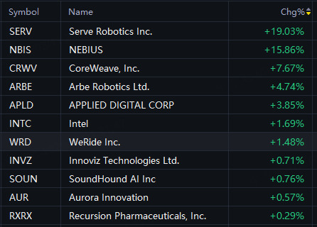 Serve Robotics up 19%; Nebius up 16%; CoreWeave up 8%; Arbe Robotics up 5%; APLD up 4%; Intel up 2%.
