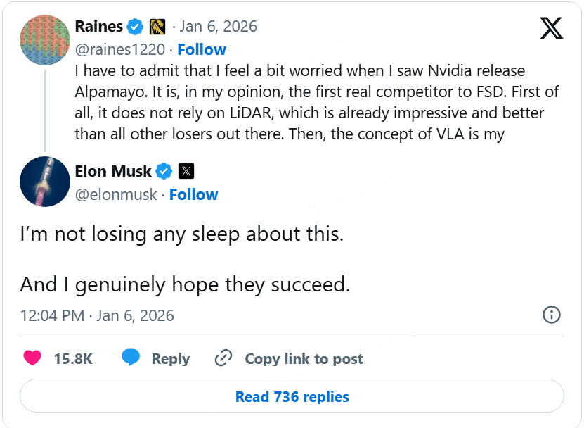 Tesla CEO Elon Musk doesn’t seem worried. Earlier in 2026, he said that he is “not losing any sleep about” Nvidia’s self-driving technology, adding “I genuinely hope [Nvidia] succeeds.”