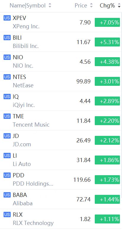 XPeng rose 7%; Bilibili rose over 5%; Nio rose over 4%; NetEase rose 3%; iQiyi, JD.com rose over 2%.