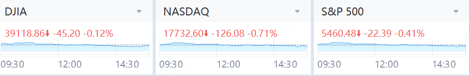 The Dow Jones Industrial Average fell 45.20 points, or 0.12%, to 39,118.86 the S&P 500 slid 22.39 points, or 0.41%, to 5,460.48 and the Nasdaq Composite dropped 126.08 points, or 0.71%, to 17,732.60.