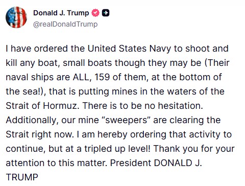 Trump: Ordered Navy to Shoot Any Boat Putting Mines In Hormuz