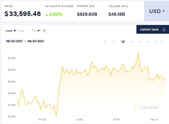 周三,比特币从昨日低位反弹18%,一度重上3.4万美元,美股午盘后小幅回落至3.3万美元上方,24小时内涨4%。主流数字货币多数上涨,有分析称上涨动因不明,加密货币波动性一直很大。与比特币相关的“一揽子股票”今日也集体反弹。特斯拉涨近5%,Square涨近2%,均接近两个月高位。灰度比特币信托最高涨超6%,脱离年内低位,今年以来仍整体下跌。Coinbase涨超2%,仍接近上市来低位。上述个股都是“木头姐”持仓重头。