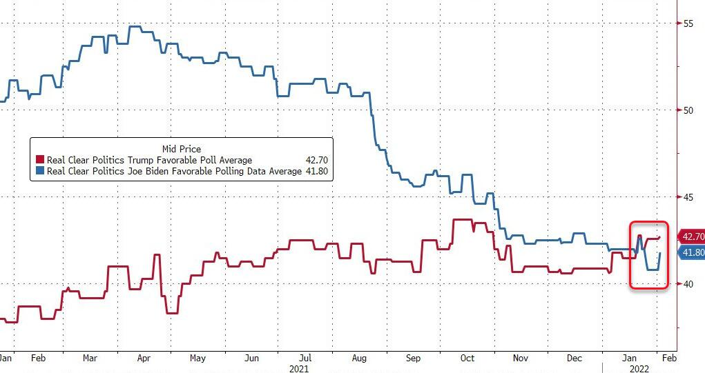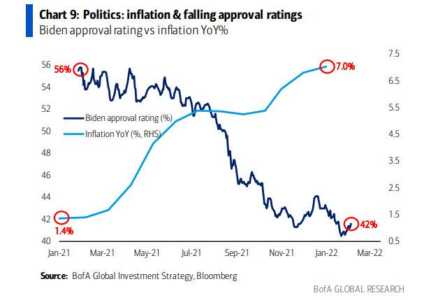 更糟糕的是,美国银行的研究显示,拜登的支持率和通胀水平正在出现一种背离的趋势:随着通胀率从去年1月的1.4%飙升至今年1月的7%,拜登的支持率正从56%回落至42%。