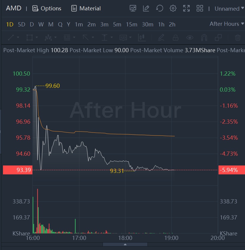 Advanced Micro Devices Inc. shares declined 5.94% in the extended session Tuesday after the chip maker's revenue forecast fell below the Wall Street consensus after posting record sales, topping Street expectations and reporting a huge surge in data-center sales."Taking a step back, while there has been additional softness in the PC market in recent months, we believe we're very well positioned to navigate through the current environment based on the strength of our existing product portfolio and upcoming product launches," Lisa Su, AMD's chief executive, told analysts on a conference call.