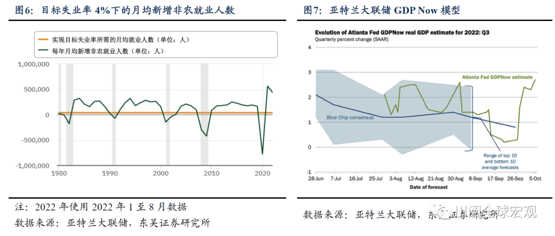 4月以来,新增非农就业持续超预期,尽管职位空缺有所下降,但仍处高位,这意味着就业增长放缓的过程将是渐进的。美国劳动力市场仍具备韧性,亚特兰大联储模型显示,2022年1-8月美国月均新增非农就业人数远高于目标失业率为4%下所需的新增非农就业人数(图6)。种种迹象显示着美国经济也仍旧强劲,亚特兰大联储对三季度美国实际GDP环比增速的预测已上修至2.7%(图7)。