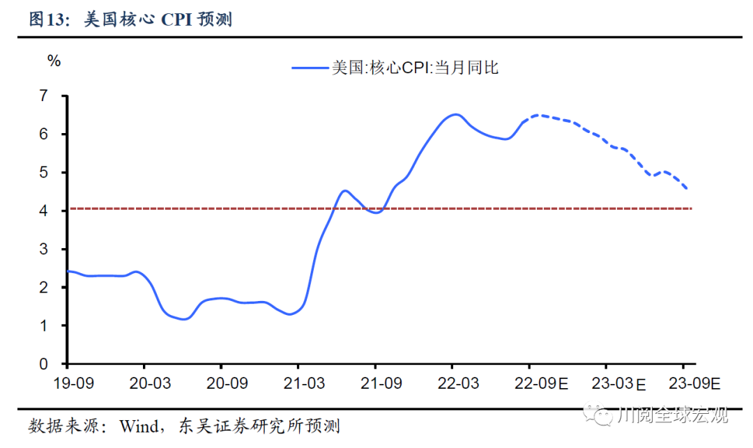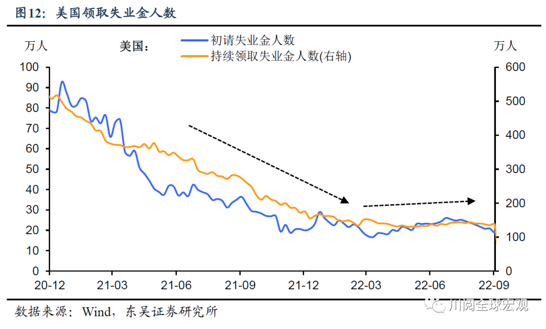维度四:先行指标初次审请失业金人数持续上升,预示着就业市场疲弱。初次审请失业金人数作为高频数据,在劳动力市场走弱的情况下,该指标的持续上升通常领先于就业人数的稳步下降。尽管初次审请失业金人数持续大幅下降的趋势已经在2021年结束,但当前(2022年9月)仍然处于低位(图12)。
