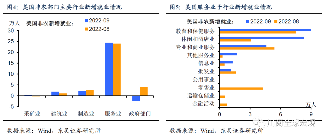 下面我们从行业维度来分析9月就业数据,其中增长最为显著的行业仍为休闲和酒店业以及教育和保健服务业(图5)。休闲和酒店业就业9月增加了8.3万个工作岗位,持平于1-8月的均值,其中仅食品服务和饮酒场所就业便增加6万人。不过鉴于休闲和酒店业就业人数与疫情前水平仍有差距,我们预计年内该行业的就业增长仍将维持强劲的态势。9月医疗保健就业人数增加6万人,已恢复至2020年2月的水平。尽管存在青年劳动力返校的季节性逆风因素,但9月非农新增就业数仅略低于8月,美国劳动力市场仍旧强劲。