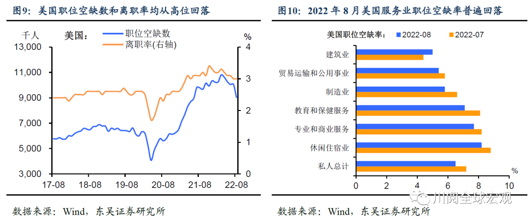 维度二:劳动力供需两侧的缓解状况,重要指标包括职位空缺和离职率。2022年4月以来,美国职位空缺数和离职率持续回落,8月休闲住宿业、教育和保健服务、专业和商业服务的职位空缺率较7月下降0.5至1个百分点(图9-图10)。尽管美国劳动力市场供需情况有所改善,服务业就业需求的缓解有望使得薪资增速从高位回落,但职位空缺和离职率仍远高于疫情前水平。