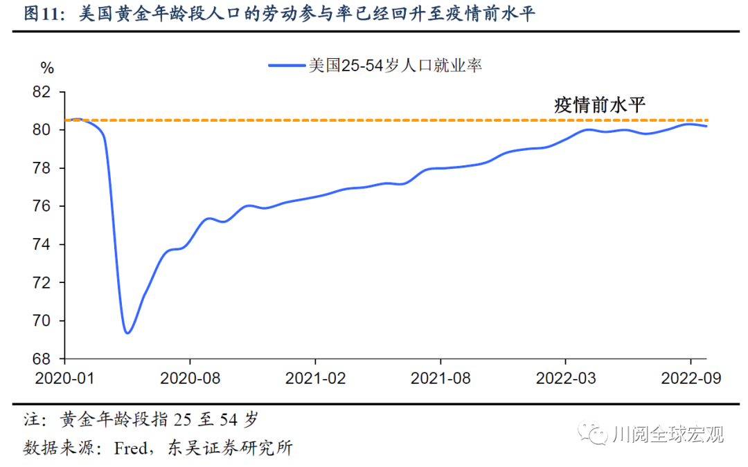维度三:劳动力参与率改善的停滞。我们认为劳动力参与率的提升已基本见顶,8月劳动力参与率的提升得益于暑期青年人口参与情况的好转,属于季节性因素,鉴于黄金年龄段人口的就业率已恢复至疫情前水平,后续劳动参与率回升空间有限(图11)。