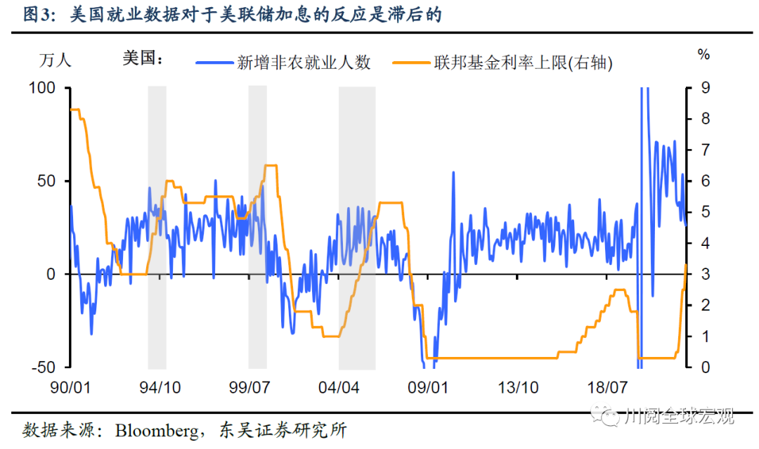 在3-9月短短几个月的时间,美联储已经共计加息300bp,可是劳动力市场的降温却迟迟没有到来,主要原因在于就业数据的滞后性。从历史数据上看,美国新增就业对于美联储加息的反应是“钝化”的,加息可以抑制住新增非农就业数的上行趋势,但该趋势的逆转往往与加息周期的峰值同步(图3)。