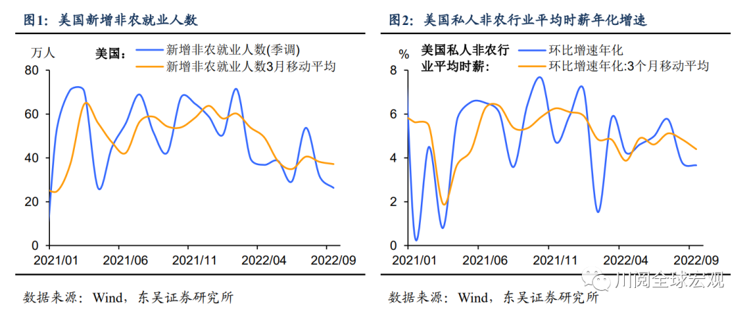 2022年9月美国非农数据全面超预期:新增非农就业26.3万人(彭博一致预期25万人),1至9月月均新增非农就业人数高达42万人,失业率下降0.2%至3.5%(预期3.7%),劳动力参与率仅略降至62.3%。就业市场仍紧俏,薪资同比增速仍居5%的高位下,美联储加息的鹰派态度将更为坚定。数据发布后,联邦基金利率期货预测11月美联储加息75bp的可能性由85.5%升至92%,美股转跌,美元指数直线拉升。
