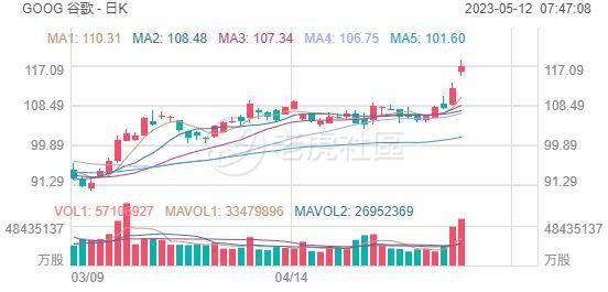 在前一天谷歌在年度开发者大会Google I/O 2023上发布了新的通用大语言模型PaLM 2,并宣布旗下产品广泛应用AI技术功能之后,5月11日周四,谷歌母公司Alphabet股价受此提振,盘中大涨5%,一度接近118美元,创下去年8月以来的新高。