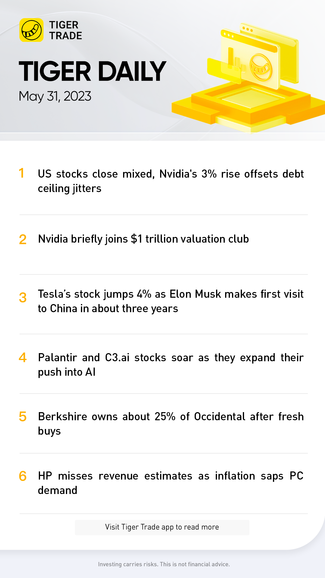 May 30 (Reuters) - Stocks on Wall Street closed mixed on Tuesday, pressured by worries about U.S. lawmakers opposed to a deal to raise the $31.4 trillion debt ceiling, but supported by another surge in Nvidia shares that briefly lifted the chipmaker into the rare club of companies valued at $1 trillion.