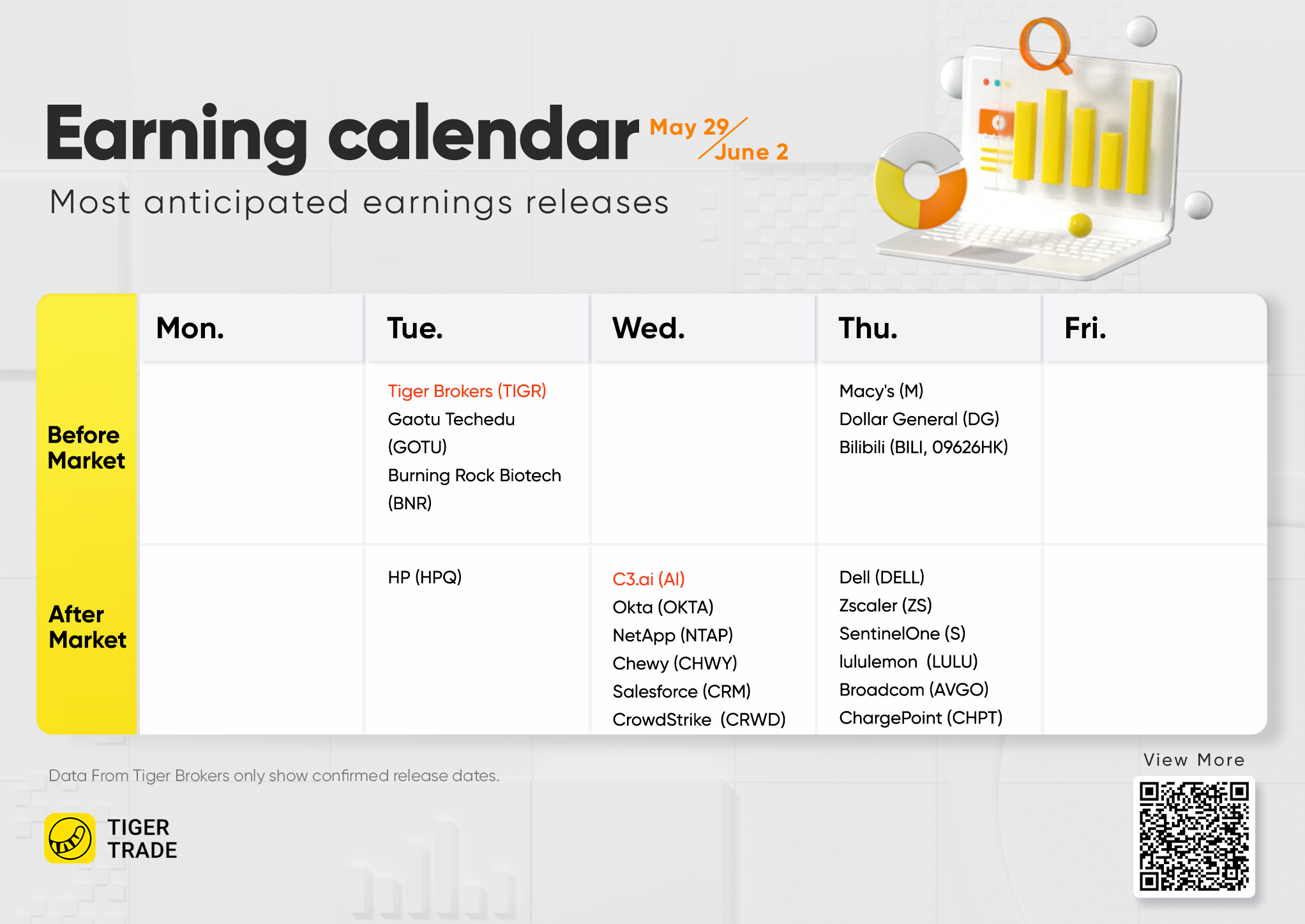 Earnings highlights will include results from Hewlett Packard Enterprise and HPInc. on Tuesday, then C3.ai, Okta, Chewy, and Salesforce on Wednesday. Broadcom, Dell Technologies, Dollar General, and Lululemon Athletica will report on Thursday.