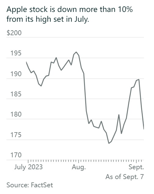 Apple is having a rough week ahead of the expected launch of the iPhone 15. Shares were falling Thursday, adding to the previous day’s losses.