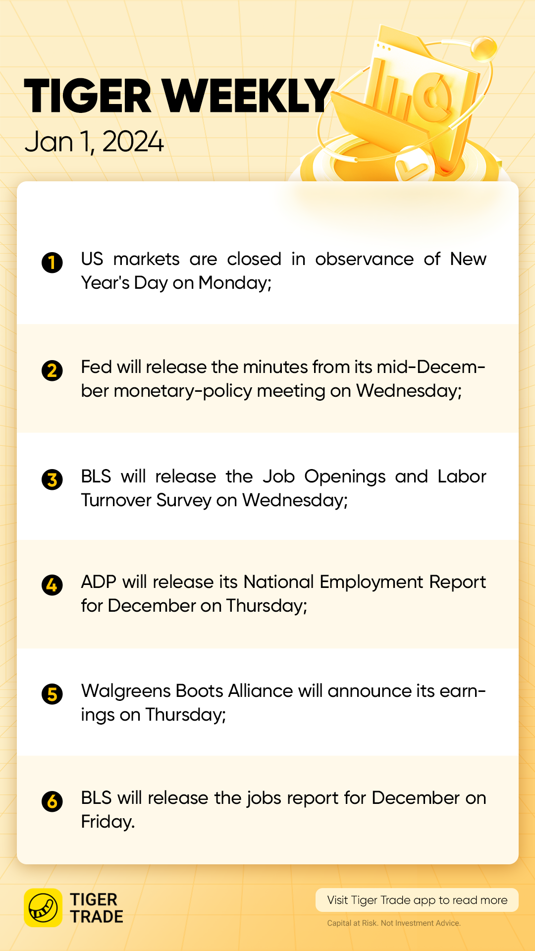 Stock and bond markets will be closed on Monday for New Year's Day, with 2024 trading kicking off on Tuesday. The latest slate of U.S. labor-market data will be the highlight of the holiday-shortened week once investors return.