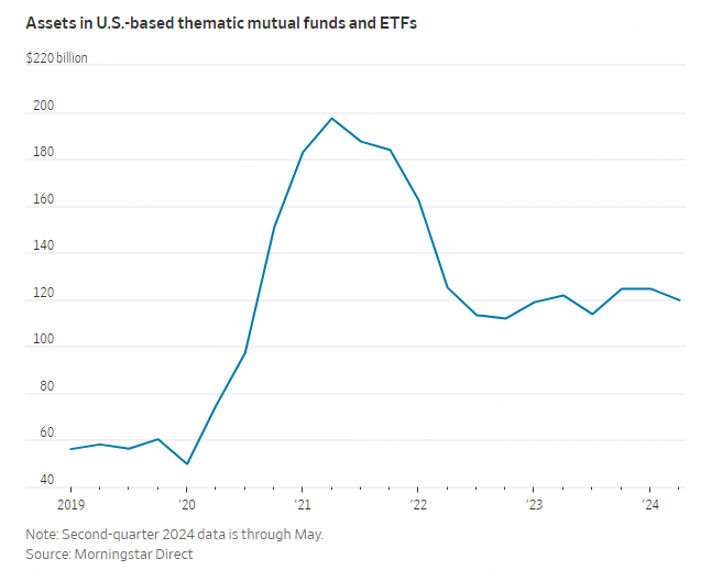 Assets in U.S. thematic funds peaked at nearly $200 billion in 2021 and have since dropped to $120 billion, according to Morningstar Direct, even though major stock indexes are trading near records.