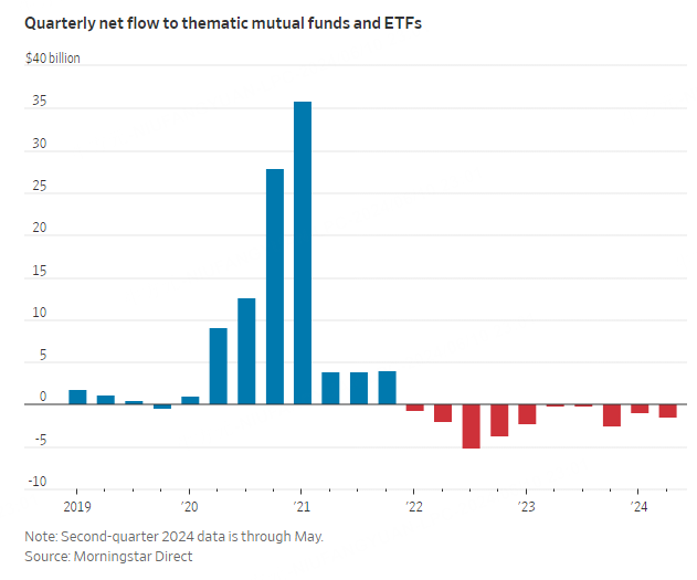 Thematic funds are struggling to bring in investors even as total fund flows have been strong in 2024. Investors have pulled money from U.S.-based thematic funds for nine consecutive quarters, according to Morningstar Direct, with outflows over that period totaling almost $20 billion. Quarterly inflows to the category peaked at $35.8 billion in the first quarter of 2021, when the meme-stock frenzy kicked off in earnest.