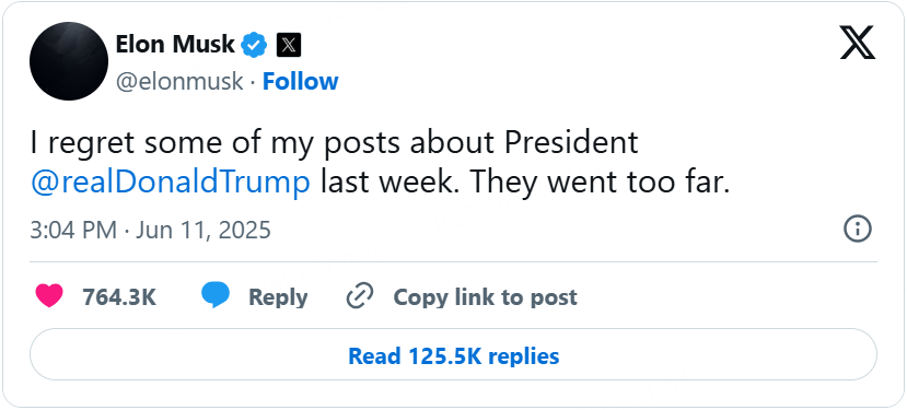 A detente between the two billionaires would remove an overhang for Tesla stock. Shares of the EV maker fell 17% in the space of two days last week after disagreements between Musk and the president descended into a war of words on social media.