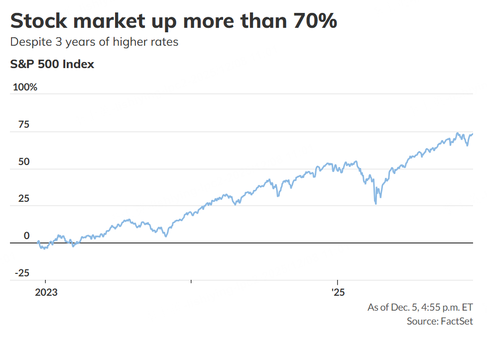 At least not when looking at the S&P 500 index, which rose to 6,870.40 in the past week, ending only 0.3% off its October record, according to Dow Jones Market Data. It was 16.8% higher on the year through Friday, poised for another stellar year of gains.