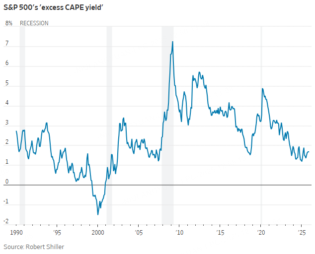 One popular version of this metric, known as the "excess CAPE yield," uses S&P 500 companies' average earnings from the past 10 years and adjusts both those earnings and the 10-year Treasury yield for inflation.