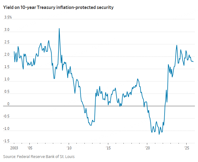Negative yields on 10-year TIPS showed investors expected rates to stay at rock-bottom levels for the foreseeable future. Now, though, those yields have stabilized at precrisis levels. Analysts ascribe that partly to higher inflation and larger federal budget deficits but also to hopes for stronger economic growth -- driven by private-sector investment in areas such as AI infrastructure and renewable energy.