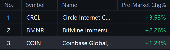 Circle shares jumped 4%; BitMine up 2%; Coinbase up 1%.