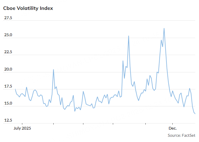 The VIX, or Wall Street’s “fear gauge,” is trading below 14 and set to end 2025 at its lowest level of the year, indicating investor confidence.