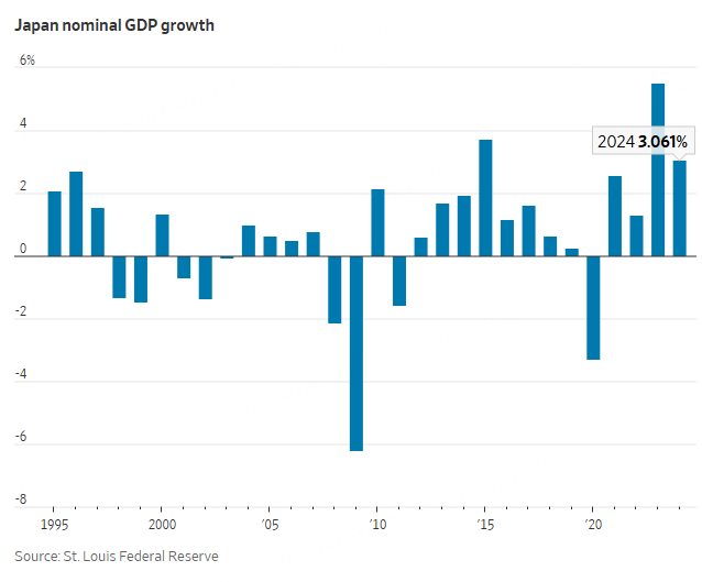 In recent years, this process has been thrown into reverse: Nominal GDP growth has averaged 3.1% over the last four years, and the debt-to-GDP ratio has in fact fallen from 212% of GDP in 2022 to around 200% now. Capital Economics says Japan is actually deleveraging faster than any major advanced economy.