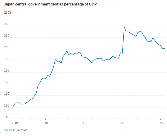 A package of tax cuts and fiscal spending from newly installed Prime Minister Sanae Takaichi is worth around 3.4% of GDP, according to Fitch Ratings. Ten-year Japanese government bond yields have jumped from 1.09% to 2.08% so far this year, while 30-year bond yields have gone from 2.28% to 3.43%, according to FactSet.