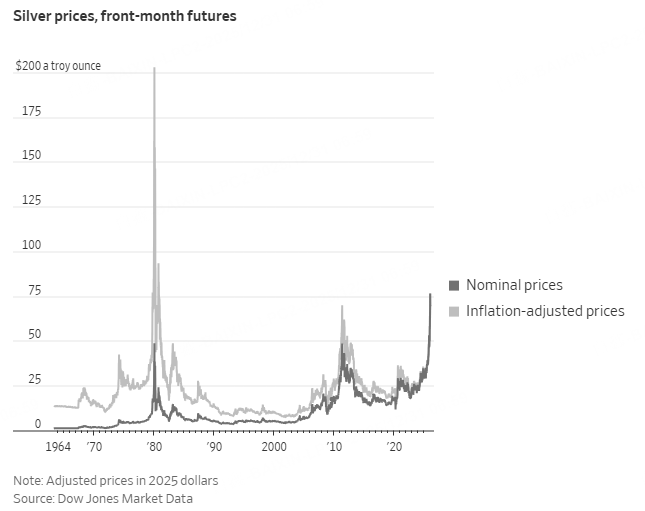 A dizzying year-end rally has pushed silver prices about 160% higher in 2025, their largest annual climb since the inflationary shock of 1979.