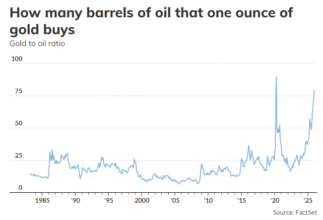 Consider this: one ounce of gold (GC00) now buys nearly 80 barrels of oil (CL00). Only once in the last 35 years has this happened when the oil price turned very briefly negative at the peak of the pandemic panic in the spring of 2020.