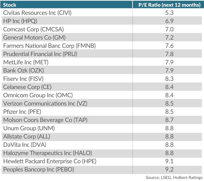 Of course, some low P/E ratio stocks deserve their low valuations, so not every stock with a low ratio proceeds to perform handsomely. To increase the probability of focusing on low P/E stocks with good performance prospects, I constructed a table of low P/E stocks that are also recommended by at least one of the top-performing newsletters my performance auditing company monitors. Each of the 20 stocks in the table recently traded at a forward P/E ratio in the single digits — less than half the S&P 500’s ratio of 22.4. These value stocks include HP, Comcast, General Motors, MetLife, Celanese, Omnicom Group, Pfizer, Allstate, Hewlett Packard Enterprise and Peoples Bancorp.