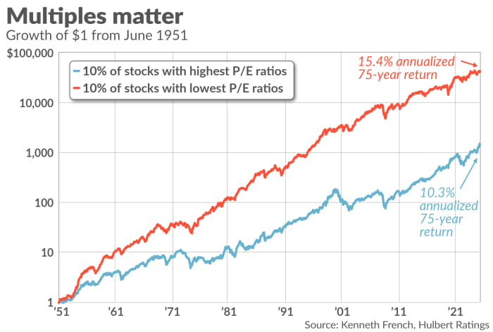 This is why conservative investors favor stocks trading at low P/E ratios. Take a look at the chart below, which plots the return of two portfolios — one containing the 10% of U.S. stocks with the lowest P/E ratios and the other containing the decile of stocks with the highest such ratios. The former beats the latter by more than five annualized percentage points since 1951.