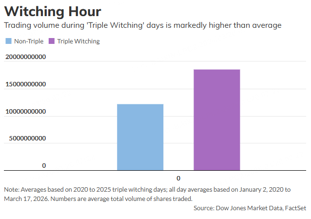 A Dow Jones Market Data analysis of historical data showed that between January 2020 and this past week, triple-witching days saw roughly one-third more trading volume than non-triple-witching days. The volume data included in the below chart represents the average total daily volume from the New York Stock Exchange, NYSE Arca, NYSE American and the Nasdaq combined.