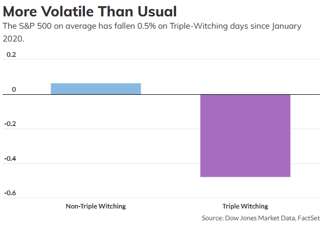 Higher volatility is also a hallmark of triple witching, according to Mike Thompson, co-CIO at Little Harbor Advisors. Thompson, along with his brother, Matt Thompson, manages portfolios with a focus on volatility and risk-management. An analysis by Dow Jones Market Data found that the S&P 500 has tallied an average decline of 0.5% on triple-witching days since January 2020.