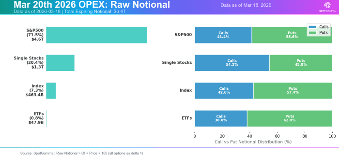 The notional value of contracts due to expire is slightly lower than the record amount that rolled off in December. Friday's expiration tally is about $6.4 trillion, compared with more than $7 trillion in December, according to figures from SpotGamma, a provider of data and analytics for the options market.