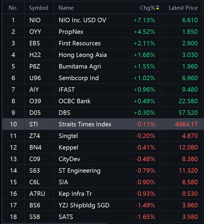 Nio up over 7%; PropNex up over 4%; First Resources up 2%; Hong Leong Asia, Bumitama Agri, Sembcorp Ind, iFast up around 1%; SIA, Kep Infra Tr down nearly 1%.
