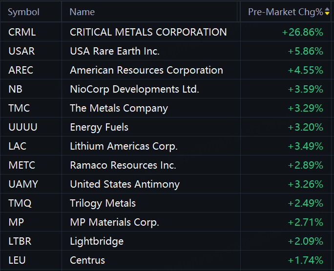 Critical Metals shares jumped 26.9% in premarket trading. Its peers also rose. USA Rare Earth rose 6%; American Resources rose 5%; NioCorp Developments rose 4%; The Metals Company, United States Antimony, Energy Fuels, Ramaco Resources, Trilogy Metals, and MP Materials Corp. rose 3%.