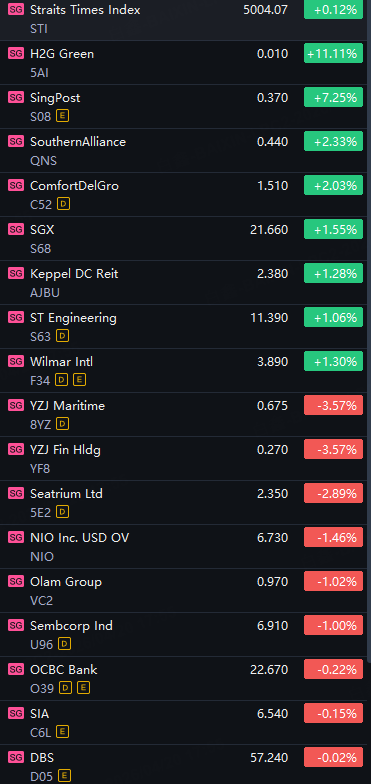 The Straits Times Index (STI), a key benchmark for the Singapore Exchange, ranged between 4,978.66 and 5,012.59 throughout the day. It ended the session at 5,004.07, up 6.14 points or 0.1% compared to Friday's close.