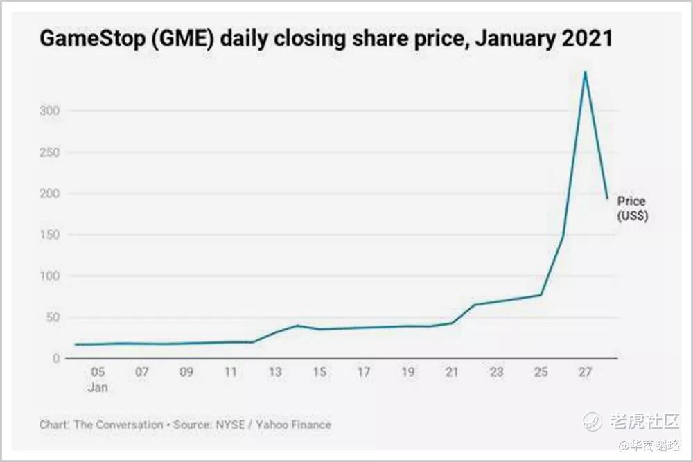 這天之前,大量美股散戶抱團,大規模買入一家線下游戲公司Gamestop(遊戲驛站,GME)的股票,硬生生地把GME這支股價在2020年長期低於10美元的“垃圾股”,拉高到最高483美元/股。